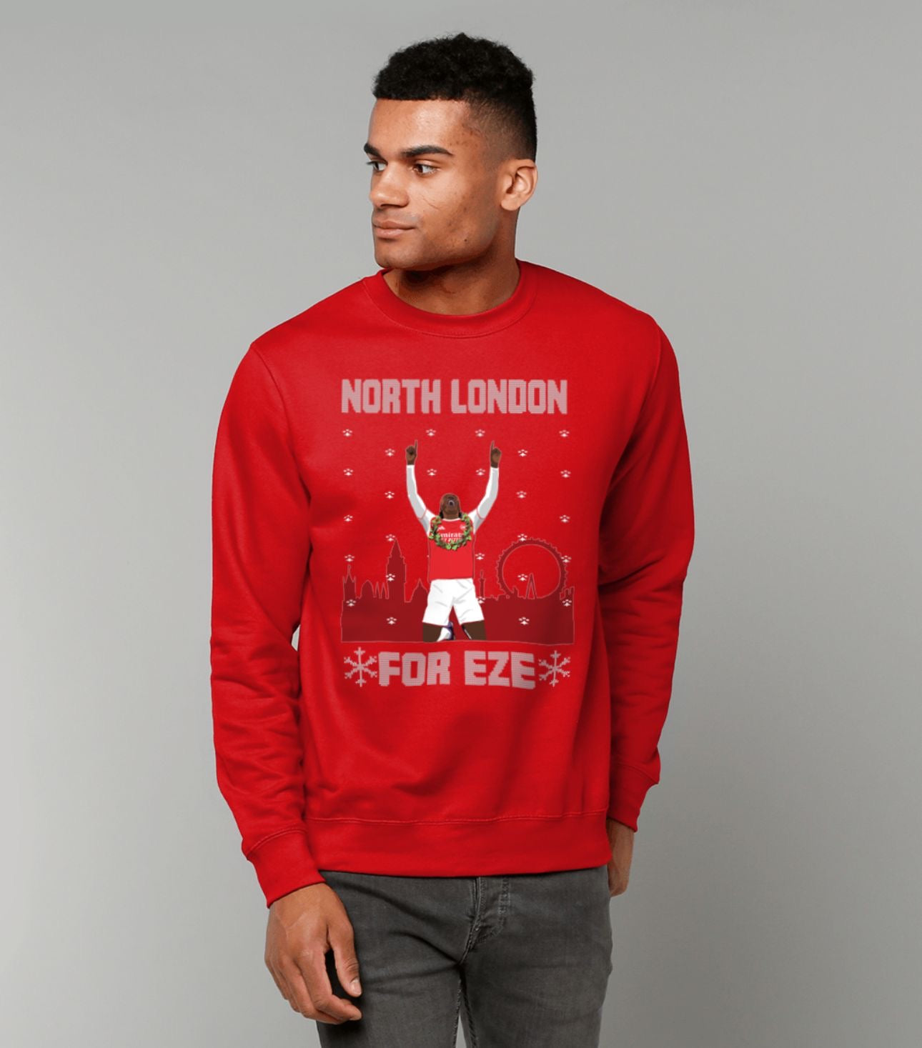 Celebrate the magic of the season with a fun and festive jumper featuring Arsenal’s latest star, Eberechi Eze. Wrapped in a Christmas wreath, snowflakes and North London spirit, this design brings together football pride and holiday cheer in the perfect cosy sweatshirt. Bold, playful, and clearly Arsenal – the ideal jumper for match days, Christmas parties or simply staying snug while showing your love for Eze.